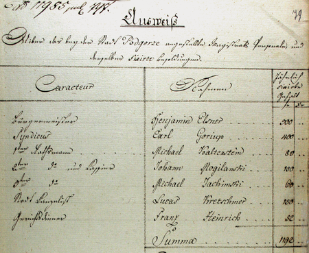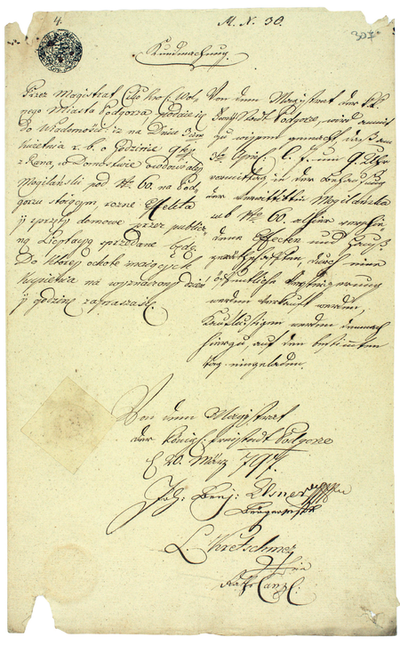 Z zespołu akt Namiestnictwa Galicyjskiego: wykaz personalny z płacami aktualny na dzień 24 kwietnia 1797 roku, sporządzony dla krajowej buchalterii – oraz zbliżenie zapisu urzędu burmistrzowskiego i imienia (Centralne Państwowe Archiwum Historyczne Ukrainy we Lwowie, sygn. fond 146, opis 88, sprawka 389, t. 17, s. 79)Z akt spadkowych i opiekuńczych Podgórza obejmujących lata 1796–1854: ogłoszenie magistrackie z 1797 roku o publicznej licytacji ruchomości po zmarłym Janie Mogilańskim, podpisane przez burmistrza miasta – oraz zbliżenie podpisu i zapisu urzędu (Archiwum Narodowe w Krakowie, sygn. P 288, s. 307)