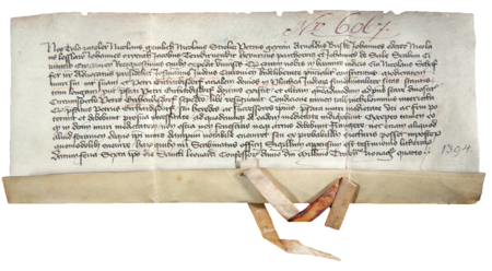 Dokument wydany w 1384 roku w Krakowie, w którym sąd ławniczy z Janem Edererem w składzie stwierdził, że Josman Żyd sprzedał połowę muru należącego do jego domu położonego przy ul. Żydowskiej (obecnie św. Anny) Piotrowi Girsdorfowi (nr 125) – oraz powiększenie zapisu imienia (Archiwum Uniwersytetu Jagiellońskiego, sygn. perg. 16)