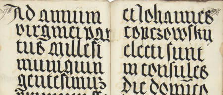 Z księgi radzieckiej Kazimierza obejmującej lata 1481–1508: fragment wpisu dokumentującego wybór rady urzędującej na rok 1501, z Janem Kopczowskim w składzie – oraz zbliżenie zapisu imienia (Archiwum Narodowe w Krakowie, sygn. K 7, s. 396– 397)