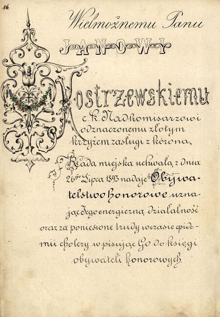 tytuł honorowego obywatela Podgórza nadany 26 lipca 1893 roku |