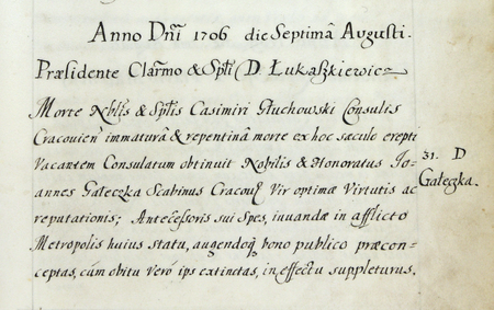 Z urzędowego spisu rajców obejmującego lata 1363–1802 fragment strony 39 z wpisem z 1706 roku o wyborze do rady na miejsce po zmarłym Kazimierzu Głuchowskim (nr 576) nowego rajcy Jana Gałeczki (nr 577), czego dokonano za kadencji burmistrzowskiej Jana Łukaszkiewicza w 1706 roku – oraz powiększenie zapisu imienia i funkcji burmistrza (Archiwum Państwowe w Krakowie, sygn. rkps 1477, s. 39)