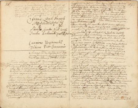 Z księgi radzieckiej Kazimierza obejmującej protokoły spraw z lat 1720–1721: strony z wpisanymi sprawami z 1720 roku; na stronie lewej blok podpisów przedstawicieli władz miejskich, z podpisem burmistrza Jana Luteckiego na czele – oraz zbliżenie podpisu z zapisem funkcji (Archiwum Narodowe w Krakowie, sygn. K 121, s. 26–27)