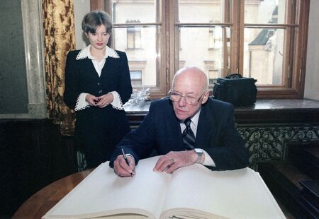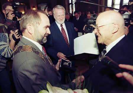 Z uroczystości wręczenia medalu i dyplomu 12 listopada 1997 r. w Pałacu Wielopolskich. Jan Nowak-Jeziorański w sali Obrad RMK oraz własnoręczny podpis uhonorowanego.