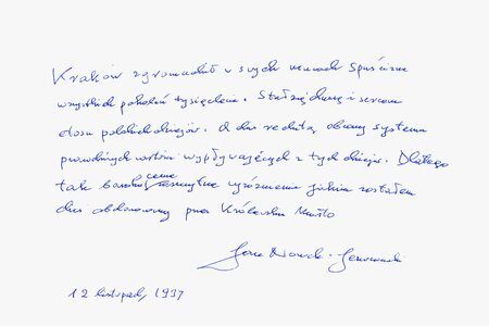 …w uznaniu szczególnych zasług dla Stołecznego Królewskiego Miasta Krakowa… (z uchwały Rady Miasta Krakowa nr LXXXIX/854/97) |