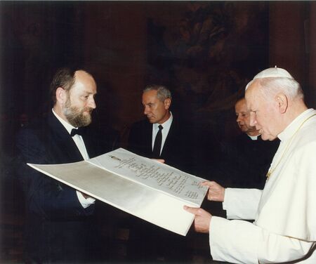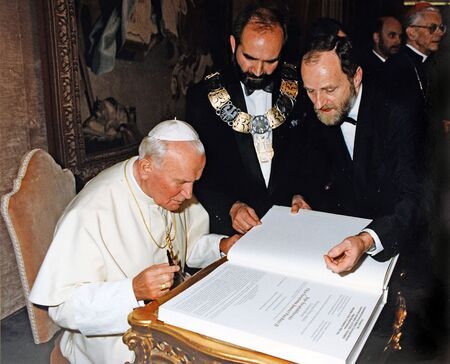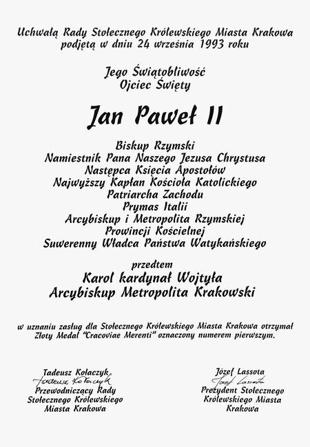 Z audiencji papieskiej udzielonej przez papieża Jana Pawła II delegacji miasta Krakowa 24 października 1993 r. w Sali Klementyńskiej Pałacu Apostolskiego w Watykanie akt złożenia podpisu w Księdze Medalu „Cracoviae Merenti" w asyście prezydenta miasta i przewodniczącego RMK oraz reprodukcja duplikatu dyplomu wręczonego wraz z medalem.