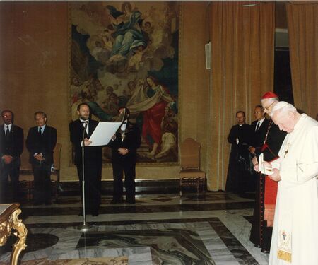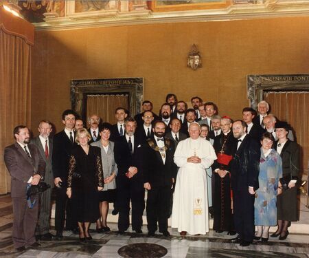 Z audiencji papieskiej udzielonej przez papieża Jana Pawła II delegacji miasta Krakowa 24 października 1993 r. w Sali Klementyńskiej Pałacu Apostolskiego w Watykanie. Odczytanie i przekazanie dyplomu złotego medalu „Cracoviae Merenti” przez przewodniczącego RMK. Zdjęcie zbiorowe delegacji z Ojcem Świętym; oprócz władz miejskich w składzie m.in. abp metropolita krakowski kard. Franciszek Macharski.