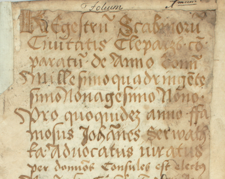 Z księgi miejskiej ławniczej Kleparza obejmującej lata 1499–1528: początkowy fragment wpisu z 1499 roku dokumentującego wybór przez radę miejską Jana Serwatki na urząd wójta miasta Kleparza – oraz zbliżenie zapisu imienia (Archiwum Narodowe w Krakowie, sygn. KL 1, s. 1)