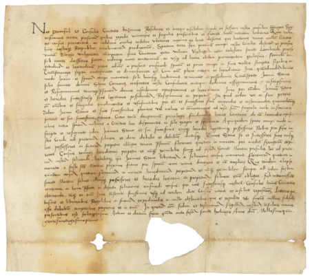 Dokument wydany w 1531 roku w Kazimierzu, w którym burmistrz i rajcy Kazimierza stwierdzają, że Jan Stano otrzymał od nich za czynszem rocznym na wieczność kawałek opuszczonego gruntu zwanego Błonie, położonego za bramą Wielicką, pod Górą Lasoty – oraz zbliżenie zapisu imienia (Archiwum Narodowe w Krakowie, sygn. perg. 501)