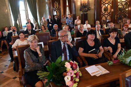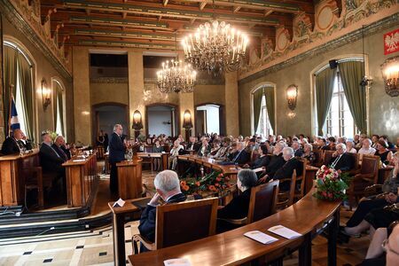 Uczestnicy uroczystości, wśród których w pierwszym rzędzie z lewej strony małżonka uhonorowanego Anna, także profesor medycyny, oraz prezentacja przez Janusza Skalskiego oryginału dyplomu; wystąpienie uhonorowanego z mównicy prezydialnej Rady.