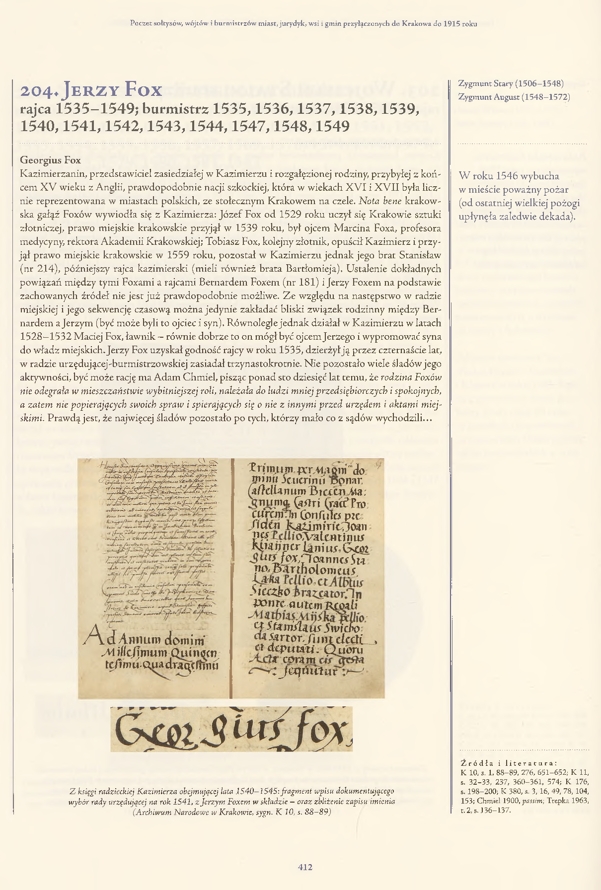 Z księgi radzieckiej Kazimierza obejmującej lata 1540–1545: fragment wpisu dokumentującego wybór rady urzędującej na rok 1541, z Jerzym Foxem w składzie – oraz zbliżenie zapisu imienia (Archiwum Narodowe w Krakowie, sygn. K 10, s. 88–89)