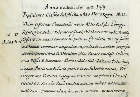 Z urzędowego spisu rajców obejmującego lata 1363–1802 fragment strony 36 z wpisem z 1701 roku o wyborze do rady miejskiej Pawła Soldadiniego (nr 572), jak zapisano: „po śmierci szlachetnego i wielce zasłużonego Jerzego Kentza, który zarówno na urzędzie ławnika, jak i potem rajcy, dołożył wiele pracy dla dobra publicznego i poprawy warunków życia” – oraz powiększenie zapisu imienia (Archiwum Państwowe w Krakowie, sygn. rkps 1477, s. 36)