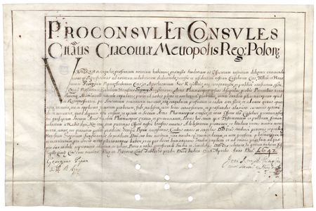 Dokument wydany w 1642 roku w Krakowie, w którym burmistrz i rajcy miasta Krakowa zaświadczają, że Jerzy Pipan, ławnik krakowski i aptekarz królewski, przed urzędem radzieckim wyzwolił Grzegorza Samsonowicza po sześciu latach praktyki na towarzysza sztuki farmaceutycznej – oraz jego własnoręczny podpis (Biblioteka PAU/PAN w Krakowie, sygn. Dok. perg. 236)