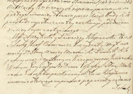 Z księgi wójtowsko-ławniczej Kleparza obejmującej lata 1769–1794: fragment wpisu z 1793 roku dokumentującego sprawę egzekucji wyroku sądu wielkorządowego w sprawie posesji Walterów, podjętej przez Józefa Boosiewicza, wówczas burmistrza i wójta Kleparza – oraz zbliżenie zapisu imienia i funkcji (Archiwum Narodowe w Krakowie, sygn. KL 21, s. 320)