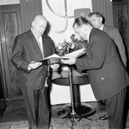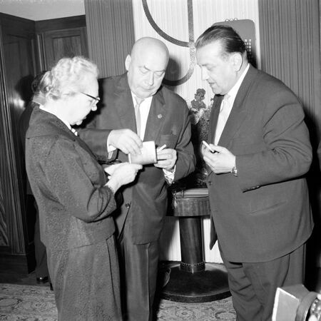 Wręczenie przez Zbigniewa Skolickiego dyplomu honorowego obywatelstwa 16 czerwca 1961 r. w gabinecie prezydenckim (widoczna dekoracja gabinetu inicjałem uhonorowanego), matka Józefa Cyrankiewicza, Regina, oglądająca dyplom oraz scena po wręczeniu Józefowi Cyrankiewiczowi dodatkowego wyróżnienia w postaci złotej odznaki „Za pracę społeczną dla miasta Krakowa”.