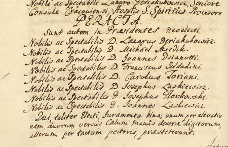 Z księgi radzieckiej obejmującej lata 1744–1747 fragment strony 556 z wykazem rajców urzędujących nominowanych na rok 1745, wśród których znajduje się Józef Florkowski – oraz powiększenie zapisu imienia (Archiwum Państwowe w Krakowie, sygn. rkps 479, s. 556)