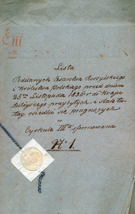 Z akt senackich Wolnego Miasta Krakowa dotyczących imigrantów i emigrantów tytułowy oraz końcowy fragment sporządzonego w 1843 r. przez komisarza Józefa Nowaka spisu przybyłych do Krakowa poddanych Królestwa Polskiego i cesarstwa rosyjskiego (Archiwum Narodowe w Krakowie, sygn. WMK V-173, s. 1115, 1201)