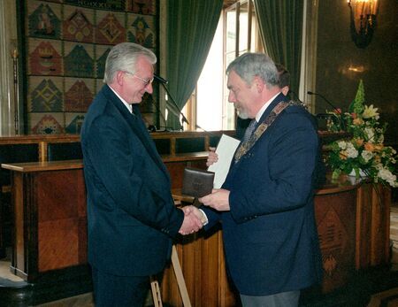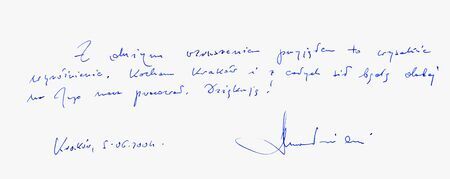 Z uroczystości wręczenia medalu z dyplomem 5 czerwca 2004 r. w Pałacu Wielopolskich. Uhonorowany prezentuje w sali Obrad RMK dyplom; własnoręczny podpis uhonorowanego.