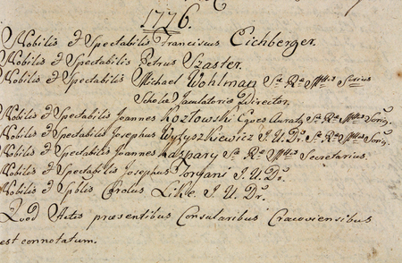 Z księgi radzieckiej obejmującej lata 1774 –1776 fragment strony 625 z wykazem rajców urzędujących nominowanych na rok 1776, wśród których znajduje się Józef Toryani – oraz powiększenie zapisu imienia (Archiwum Państwowe w Krakowie, sygn. rkps 485, s. 625)