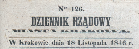 Urzędowe obwieszczenie z 1845 r. o cenach na publicznej targowicy w Krakowie, podpisane – obok komisarza targowego – przez komisarza Józefa Tuszyńskiego (DzRzWMK 1846, nr 126, s. 508)