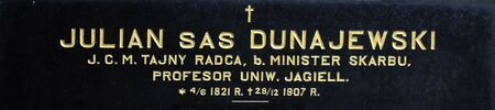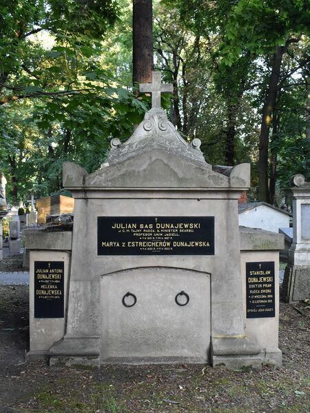 Julian Antoni Dunajewski z Dunajewa, herbu Sas, ekonomista, prawnik, profesor i rektor Uniwersytetu Jagiellońskiego, polityk, minister skarbu Austrii. Urodzony 4 czerwca 1821 r. w Stanisławowie (obecnie Iwano-Frankiwsk na Ukrainie) w rodzinie wywodzącej się z Dunajewa w ziemi lwowskiej, syn urzędnika Szymona i Antoniny z Błażowskich, brat Albina, kardynała, szwagier Karola Estreichera. Ekonomista po uniwersytetach Lwowskim i Wiedeńskim, doktor praw po UJ, od 1860 r. był profesorem tej uczelni, a także trzykrotnie jej rektorem. Od 1872 r. członek Akademii Umiejętności. Aktywny politycznie w nurcie konserwatywnym. W latach 1873–1891 w wiedeńskiej Radzie Państwa w Izbie Posłów, od 1897 r. dożywotnio w Izbie Panów, w latach 1869–1907 w Sejmie Krajowym z okręgu Nowy Sącz, w latach 1869– 1881 w Radzie Miejskiej Krakowa. W latach 1880–1891 minister skarbu Austrii. Doktor h.c. UJ, kawaler Orderu Cesarza Leopolda, odznaczony austriackim Orderem Krzyża Żelaznego I kl. Honorowy obywatel także Nowego Sącza i Jasła. Żonaty z Marią z Estreicherów, mieli synów Stanisława Antoniego, starostę tarnowskiego, i Juliana mł. oraz córkę Marię Julię. Zmarł 27 grudnia 1907 r. w Nowym Sączu; pochowany w Krakowie na cmentarzu Rakowickim.