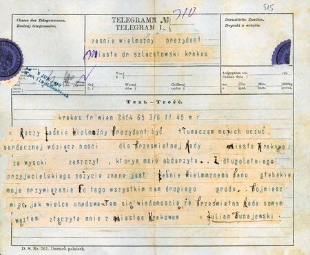 Reprodukcja telegramu wysłanego 3 lipca 1887 r. z Wiednia przez Juliana Dunajewskiego na ręce prezydenta miasta oraz miejsce spoczynku – grób rodzinny w kwaterze 24 cmentarza Rakowickiego w Krakowie wraz ze zbliżeniem tablicy nagrobnej.