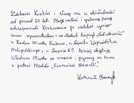 …w uznaniu szczególnych zasług dla Stołecznego Królewskiego Miasta Krakowa… (z uchwały Rady Miasta Krakowa nr XLII/1122/20) |