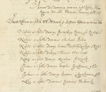 Z księgi radzieckiej obejmującej lata 1701–1710 fragment strony 818 z wykazem rajców urzędujących wybranych na rok 1705, wśród których znajduje się Kazimierz Głuchowski – oraz powiększenie zapisu imienia (Archiwum Państwowe w Krakowie, sygn. rkps 474, s. 818)
