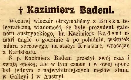 Kazimierz Feliks Badeni, hrabia, herbu Bończa, polityk, premier austriacki, namiestnik Galicji. Urodzony 14 października 1846 r. w Surochowie k. Jarosławia, syn Władysława, posła do Sejmu Krajowego, i Cecylii z domu Mier, brat Stanisława Marcina (por. s. 356–357). Ukończył Uniwersytet Jagielloński z tytułami doktora praw i filozofii. Po praktyce w Namiestnictwie we Lwowie został starostą powiatowym: od 1871 r. w Żółkwi, od 1873 r. w Rzeszowie i od 1886 r., już w randze radcy Namiestnictwa, w Krakowie. W 1888 r. mianowany namiestnikiem Galicji, urząd ten sprawował do 1895 r. W tymże roku cesarz powierzył mu urząd premiera rządu austriackiego (Przedlitawii). Rząd ten upadł w 1897 r. (jedną z przyczyn było zrównanie języków czeskiego i niemieckiego). Przez 5 kadencji, od 1882 r. do śmierci, był posłem do Sejmu Krajowego Galicji. Od 1878 r. cesarski szambelan, od 1888 r. rzeczywisty tajny radca. Kawaler wielu orderów, w tym Krzyża Wielkiego Orderu Leopolda. Honorowy obywatel m.in. także Lwowa. Żonaty z Marią Apolonią ze Skrzyńskich, ojciec Ludwika Józefa oraz Marii 1° v. Krasińskiej, 2° v. Zamoyskiej. Zmarł 9 lipca 1909 r. w miejscowości Krasne; pochowany w nieistniejącej już krypcie Badenich w Busku koło Lwowa, gdzie miał majątek.