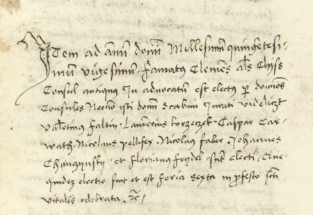 Z księgi miejskiej ławniczej Kleparza obejmującej lata 1499–1528: wpis z 1720 roku dokumentujący wybór wójta i członków ławy miejskiej; wójtem został wybrany Klemens zwany Klisz, rajca stary – oraz zbliżenie zapisu imienia i urzędu (Archiwum Narodowe w Krakowie, sygn. KL 1, s. 335)