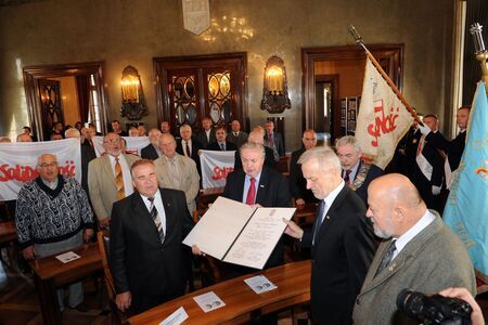 Widok Sali Obrad RMK po wręczeniu medalu i dyplomu, na pierwszym planie przy dyplomie od lewej strony: Władysław Kielian, Wojciech Grzeszek, Mieczysław Gil i Maciej Mach; zdjęcie grupowe uczestników uroczystości na schodach wiodących z holu Kamiennego do Sali Obrad Pałacu Wielopolskich.