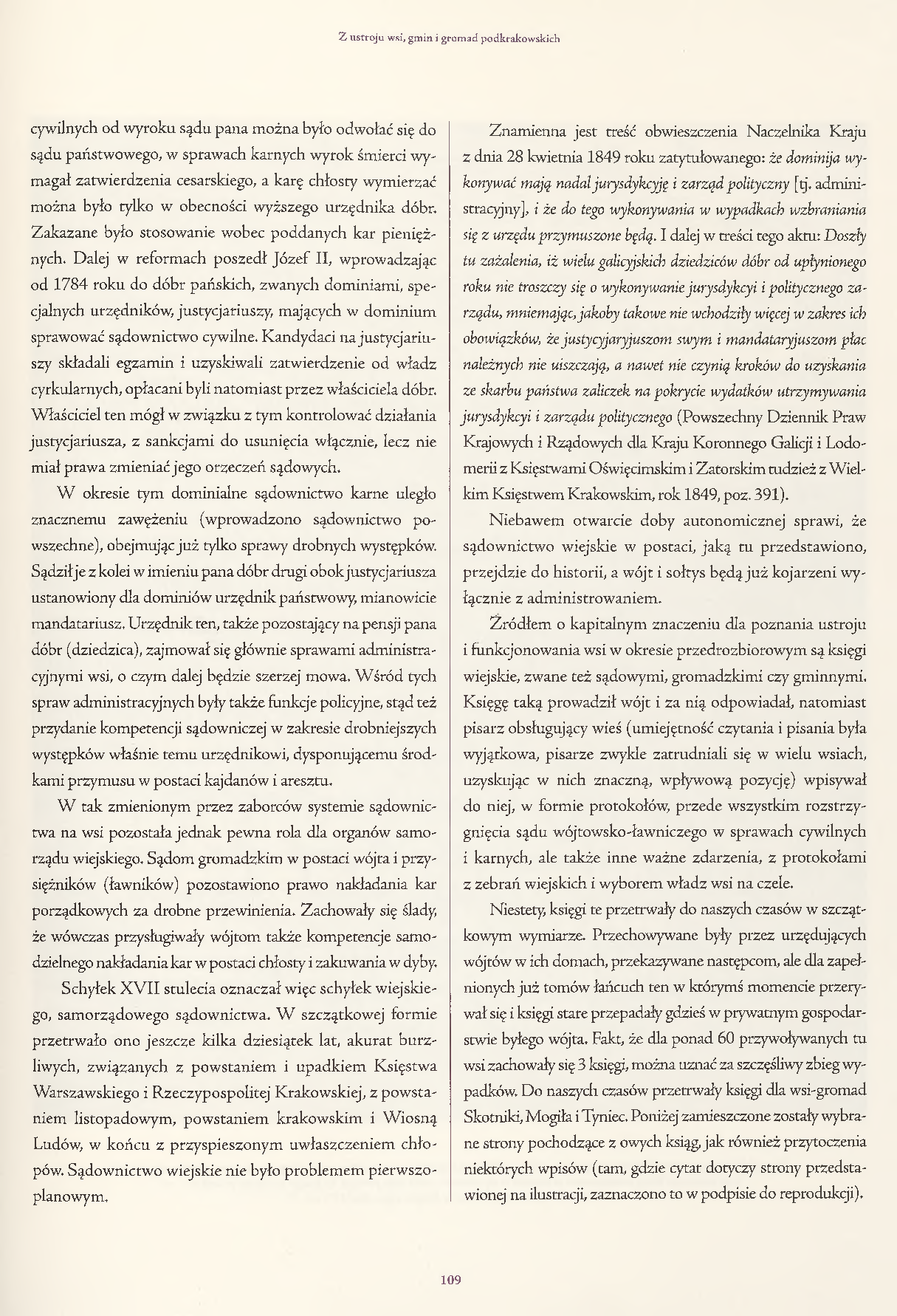Źródłem o kapitalnym znaczeniu dla poznania ustroju i funkcjonowania wsi w okresie przedrozbiorowym są księgi wiejskie, zwane też sądowymi, gromadzkimi czy gminnymi. Księgę taką prowadził wójt i za nią odpowiadał, natomiast pisarz obsługujący wieś (umiejętność czytania i pisania była wyjątkowa, pisarze zwykle zatrudniali się w wielu wsiach, uzyskując w nich znaczną, wpływową pozycję) wpisywał do niej, w formie protokołów, przede wszystkim rozstrzygnięcia sądu wójtowsko-ławniczego w sprawach cywilnych i karnych, ale także inne ważne zdarzenia, z protokołami z zebrań wiejskich i wyborem władz wsi na czele.