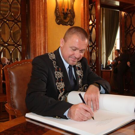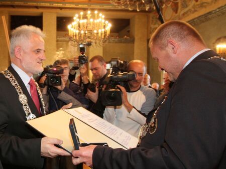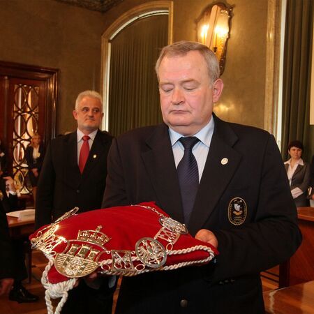 Zastępca prezesa Jan Wiesław Nalepa z darem od Kongregacji dla miasta w postaci łańcucha przewodniczącego Rady Miasta Krakowa; akt przekazania przez przewodniczącego RMK medalu i dyplomu na ręce prezesa Kongregacji.