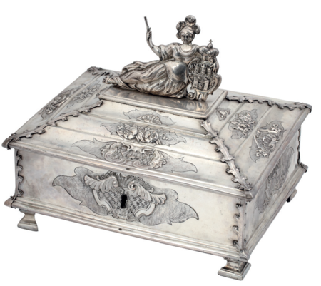 (373–376) Lada krakowskiej rady miejskiej w postaci drewnianej skrzynki obitej srebrną blachą, na czterech srebrnych nóżkach. Wieko wypukłe, u szczytu alegoryczna postać kobieca obejmująca tarczę z herbem Krakowa. Wymiary: wysokość 34 cm, szerokość 40,5 cm, głębokość 32,5 cm. Ufundowana przez magistrat krakowski w 1751 r. lada ta służyła do przechowywania cennych przedmiotów rady, jak insygnia burmistrzowskie, pieczęcie miasta, zapewne też ważne w danym czasie dokumenty, ale służyła również pisarzowi miejskiemu, przechowującemu tam materiały pisarskie. Na powiększeniu (następna strona) wspomniany już herb Krakowa (MH, nr inw. MHK 717/II/1)
