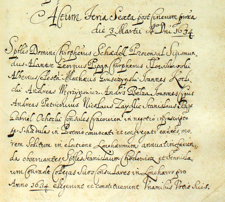 Z księgi radzieckiej dotyczącej administracji miasta obejmującej lata 1538–1643 fragment strony 455 z wpisem z 1634 roku o wyborze na lonerów Stanisława Chodowicza (nr 460) i Stanisława Konradta (nr 470), co miało miejsce, gdy burmistrzem był Krzysztof Schedel – oraz powiększenie zapisu imienia i funkcji burmistrza (Archiwum Państwowe w Krakowie, sygn. rkps 1213, s. 455)