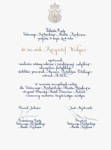 …w uznaniu szczególnych zasług dla Stołecznego Królewskiego Miasta Krakowa… (z uchwały Rady Miasta Krakowa nr XV/270/19) |