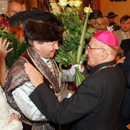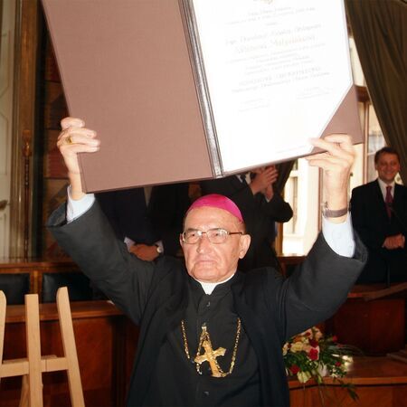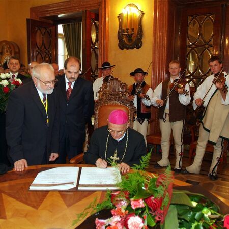 Z uroczystości wręczenia dyplomu honorowego obywatelstwa 22 czerwca 2005 r. w Pałacu Wielopolskich. Ks. bp Albin Małysiak w sali Obrad RMK oraz własnoręczny podpis uhonorowanego.