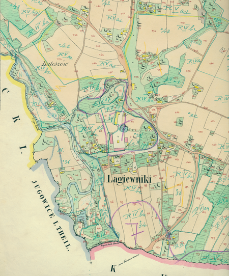 Orientacyjna lokalizacja dawnej wsi Łagiewniki w obecnych granicach Krakowa – na planie miasta oznaczono jej położenie w kształcie wyznaczonym granicami jednostki katastralnej, jaką stanowiła, ze wskazaniem najstarszego, historycznego centrum Łagiewnik w rejonie dzisiejszych ulic Myślenickiej i SobótkaCentrum Łagiewnik na mapie katastralnej sporządzonej dla gminy katastralnej Łagiewniki w 1848 roku oraz pochodzący z 1844 roku plan sytuacyjny z wyrysowanymi granicami gminy Łagiewniki oraz lokalizacją gmin sąsiadujących (Archiwum Narodowe w Krakowie, sygn. K. Krak. 336 IV; sygn. K. Krak. op. 83, s. 1)