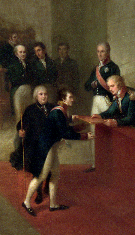 Wręczaną konstytucję przyjmuje prezes Senatu Rządzącego Stanisław Wodzicki. Przy nim stoi marszałek Zgromadzenia Reprezentantów Wincenty