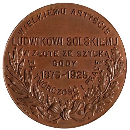 Na fotografii z 1935 r. Ludwik Solski w swoim warszawskim mieszkaniu przy pamiątkach po zaprzyjaźnionym Stanisławie Wyspiańskim – we wrześniu 1939 r. w wyniku bombardowania mieszkanie to wraz z jego cenną zawartością doszczętnie spłonęło; medal o średnicy 60 mm wybity w brązie w 1925 r. wg projektu Wincentego Wabia-Wabińskiego w jubileusz 50-lecia pracy scenicznej artysty, reprodukcja oryginału dyplomu honorowego obywatelstwa Ludwika Solskiego (patrz także s. 144) oraz jego sarkofag w Krypcie Zasłużonych na Skałce w podziemiach bazyliki św. Michała Archanioła i św. Stanisława Biskupa w Krakowie.