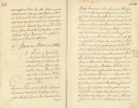 Z księgi radzieckiej kazimierskiej obejmującej lata 1759–1763: wpis dokumentujący wybór rady urzędującej na rok 1761, z Maciejem Czepigowskim w składzie – oraz zbliżenie zapisu imienia (Archiwum Narodowe w Krakowie, sygn. K 50, s. 252–253)