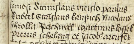 Z księgi radzieckiej Kazimierza obejmującej lata 1481–1508: fragment wpisu dokumentującego wybór rady urzędującej na rok 1492, z Marcinem Losskiem w składzie – oraz zbliżenie zapisu imienia (Archiwum Narodowe w Krakowie, sygn. K 7, s. 215)