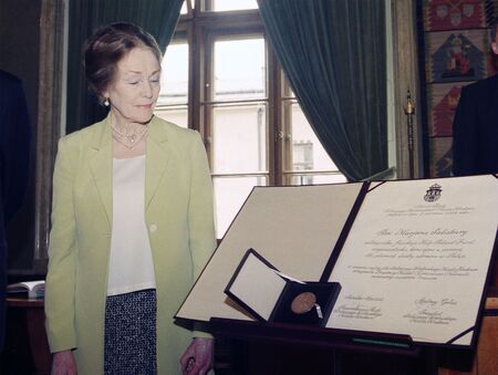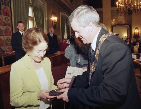Z uroczystości wręczenia medalu z dyplomem 14 maja 1999 r. w Pałacu Wielopolskich. Marjorie Salisbury w sali Obrad RMK oraz własnoręczny podpis uhonorowanej.