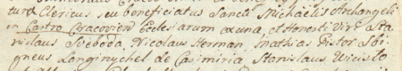 Z kopiarza przywilejów: fragment wpisu przywileju dotyczącego jeziora położonego we wsi Zabłocie, którego udzielili rajcowie kazimierscy, z Michałem w składzie – oraz zbliżenie zapisu imienia (Biblioteka Jagiellońska, sygn. rkps 136, s. 14)