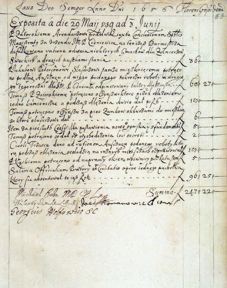 Z księgi miejskiej rachunkowej obejmującej rok 1656 przód okładziny i fragment strony 53 z okresowym zestawieniem bieżących wydatków ponoszonych przez miasto w 1656 roku, gdy funkcję lonera pełnił Michał Behm – oraz powiększenie złożonego pod tym zestawieniem jego podpisu (Archiwum Państwowe w Krakowie, sygn. rkps 2057, s. 53)
