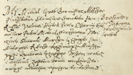 Z księgi radzieckiej Kazimierza obejmującej lata 1580–1583: początkowy fragment z wpisem z roku 1581 zawierającym ogłoszenie statutu cechu karczmarzy; na czele listy rajców urzędujących i starych zatwierdzających ten statut stoi Michał Grob, ówczesny burmistrz kazimierski – oraz zbliżenie zapisu imienia i funkcji (Archiwum Narodowe w Krakowie, sygn. K 19, s. 347)