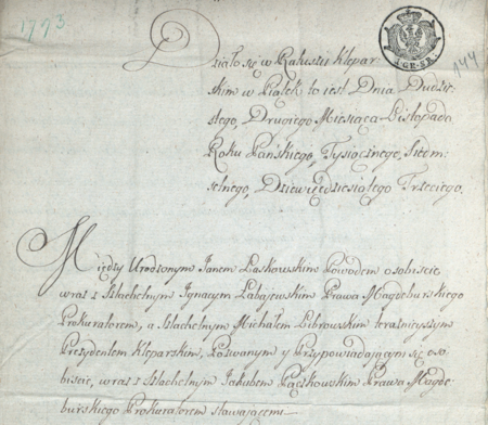 Początkowy fragment protokołu sporządzonego w 1793 roku w związku ze sprawą toczącą się przed kleparskim urzędem radzieckim z udziałem Michała Librowskiego, rajcy i ówczesnego burmistrza miasta (nazwanego tu prezydentem) w roli pozwanego – oraz zbliżenie zapisu imienia i funkcji (Biblioteka Naukowa PAU/PAN, sygn. rkps 437, s. 144)