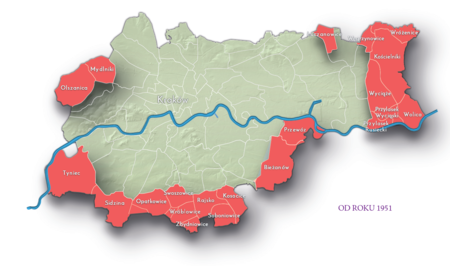 W WOJEWÓDZTWIE KRAKOWSKIM RZECZYPOSPOLITEJ POLSKIEJ, OD 1952 ROKU POLSKIEJ RZECZYPOSPOLITEJ LUDOWEJ W LATACH 1975–1984 POD NAZWĄ WOJEWÓDZTWA MIEJSKIEGO KRAKOWSKIEGO POLSKIEJ RZECZYPOSPOLITEJ LUDOWEJNa planie obrazującym dzisiejsze granice Krakowa miejscowości przyłączone do Krakowa po 1915 roku, oznaczone kolorem czerwonym określającym ich przynależność w latach 1945–1985 do województwa krakowskiego, w latach 1975–1984 województwa miejskiego krakowskiego – w Rzeczypospolitej PolskiejCiag dalszy ze strony poprzedniej: na planie obrazującym dzisiejsze granice Krakowa miejscowości przyłączone do Krakowa po 1915 roku, oznaczone kolorem czerwonym określającym ich przynależność w latach 1945–1985 do województwa krakowskiego, w latach 1975–1984 województwa miejskiego krakowskiego – w Polskiej Rzeczypospolitej Ludowej