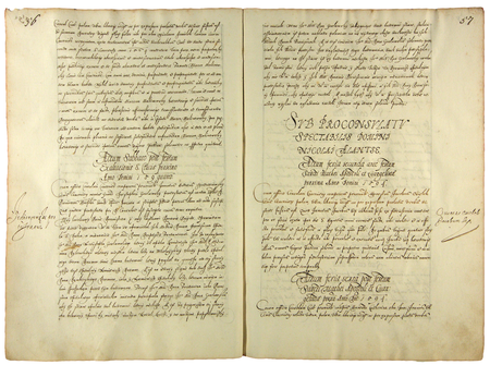 Z księgi radzieckiej obejmującej lata 1594–1597 strony 56–57 z nagłówkiem otwierającym wpisy spraw prowadzonych za kadencji burmistrzowskiej Mikołaja Alantsee w 1594 roku – oraz powiększenie zapisu imienia i funkcji burmistrza (Archiwum Państwowe w Krakowie, sygn. rkps 454, s. 56–57)