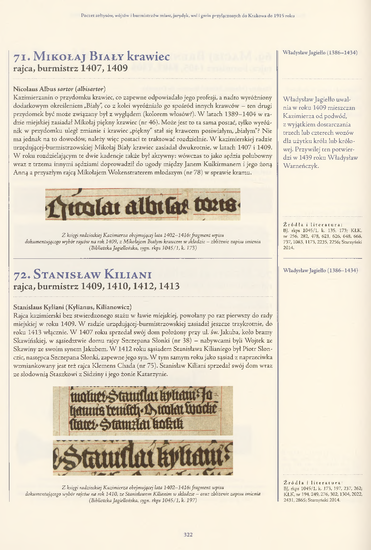 Kazimierzanin o przydomku krawiec, co zapewne odpowiadało jego profesji, a nadto wyróżniony dodatkowym określeniem „Biały”, co z kolei wyróżniało go spośród innych krawców – ten drugi przydomek być może związany był z wyglądem (kolorem włosów?). W latach 1389–1404 w radzie miejskiej zasiadał Mikołaj piękny krawiec (nr 46). Może jest to ta sama postać, tylko wyróżnik w przydomku uległ zmianie i krawiec „piękny” stał się krawcem posiwiałym, „białym”? Nie ma jednak na to dowodów, należy więc postaci te traktować rozdzielnie. W kazimierskiej radzie urzędującej-burmistrzowskiej Mikołaj Biały krawiec zasiadał dwukrotnie, w latach 1407 i 1409. W roku rozdzielającym te dwie kadencje także był aktywny: wówczas to jako sędzia polubowny wraz z trzema innymi sędziami doprowadził do ugody między Janem Kulkirmanem i jego żoną Anną a przyszłym rajcą Mikołajem Wokenstraterem młodszym (nr 78) w sprawie kramu.