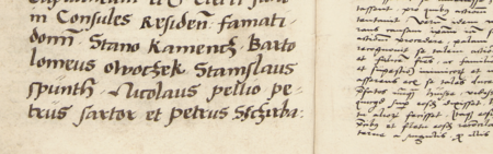 Z księgi radzieckiej Kazimierza obejmującej lata 1521–1533: fragment wpisu dokumentującego wybór rady urzędującej na rok 1526, z Mikołajem kuśnierzem w składzie – oraz zbliżenie zapisu imienia (Archiwum Narodowe w Krakowie, sygn. K 9, s. 104)